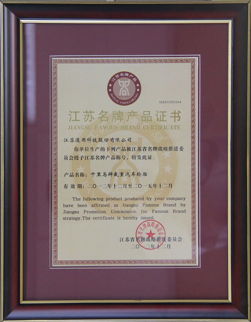千里馬牌載重汽車輪胎喜獲“江蘇名牌產品”稱號日前,2012年江蘇省名牌評選結果揭曉,江蘇省名牌戰略推進委員會組織專家評審、審議確定,授予