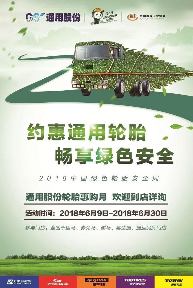 為了讓更多的普通消費(fèi)者了解什么是綠色節(jié)能輪胎,輪胎標(biāo)簽的作用,以及輪胎安全使用知識,同時也為了答謝消費(fèi)者長期以來的支持,通用股份在全國通用品牌門店(千里馬、赤兔馬、通運(yùn)、騏馬、喜達(dá)通)開展“約惠通用輪胎 暢享綠色安全”的輪胎惠購活動(2018年6月9日至6月30日),并采取滿減優(yōu)惠、幸運(yùn)抽獎、好禮相送等形式,以實(shí)實(shí)在在的優(yōu)惠,與消費(fèi)者共同擁抱安全出行。