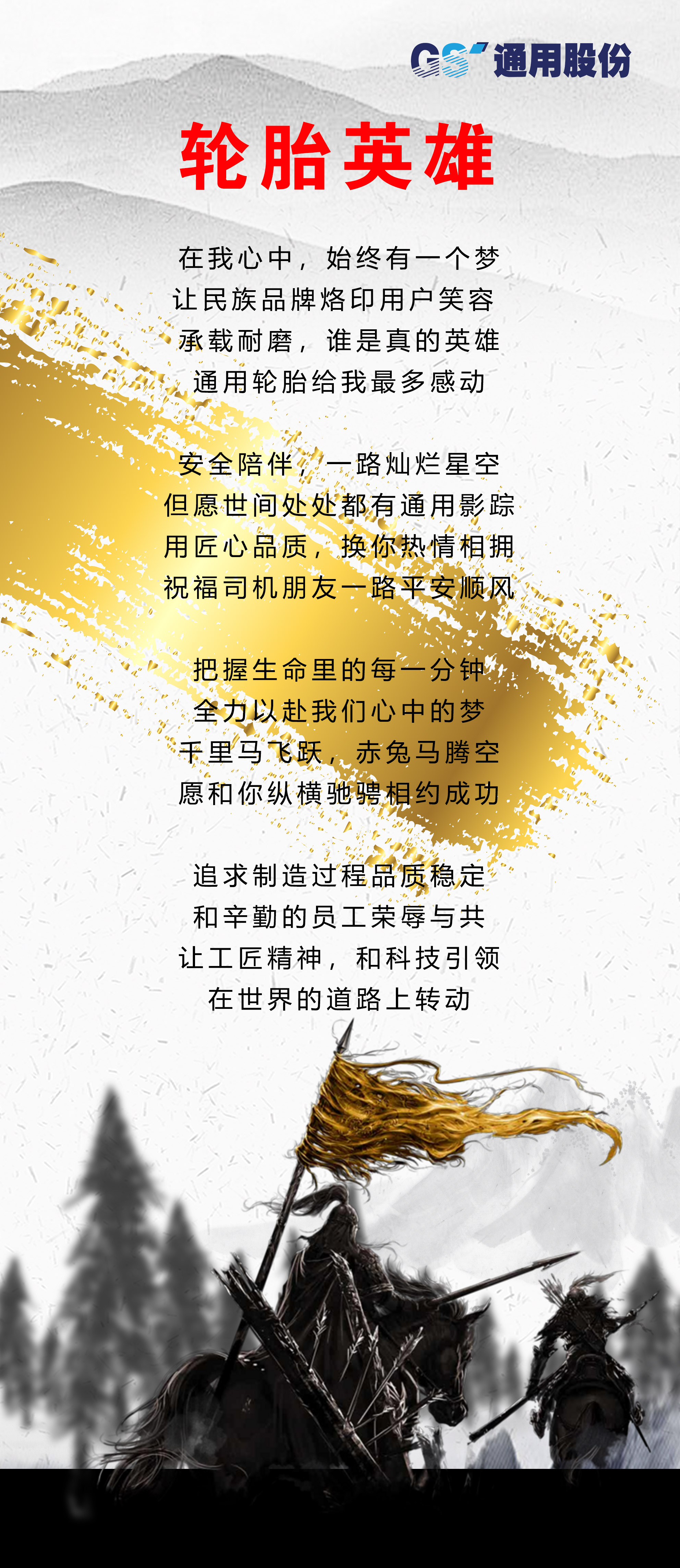 今年9月是中國第四十一個“質(zhì)量月”,也是通用股份第十四屆“科技質(zhì)量月”。滄海橫流,自強(qiáng)不息,方顯英雄本色。今年,通用股份以一首創(chuàng)編的《輪胎英雄》拉開了“科技質(zhì)量月”的帷幕,在這個風(fēng)起云涌的競爭時代,全體通用人堅(jiān)守初心,以振興民族品牌為己任,為向廣大消費(fèi)者提供更加卓越的產(chǎn)品與服務(wù)而不斷努力奮斗,推動企業(yè)邁向高質(zhì)量發(fā)展。