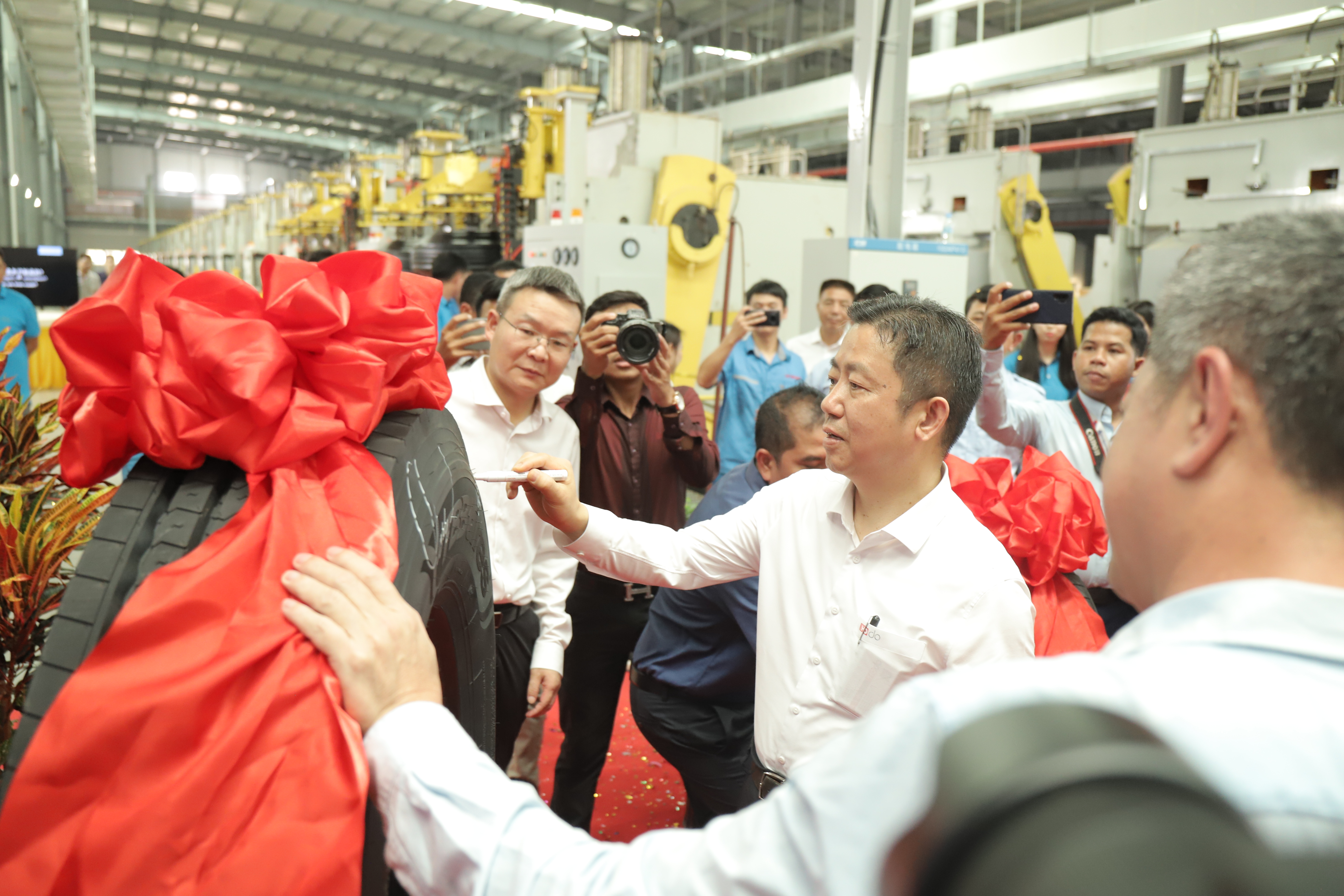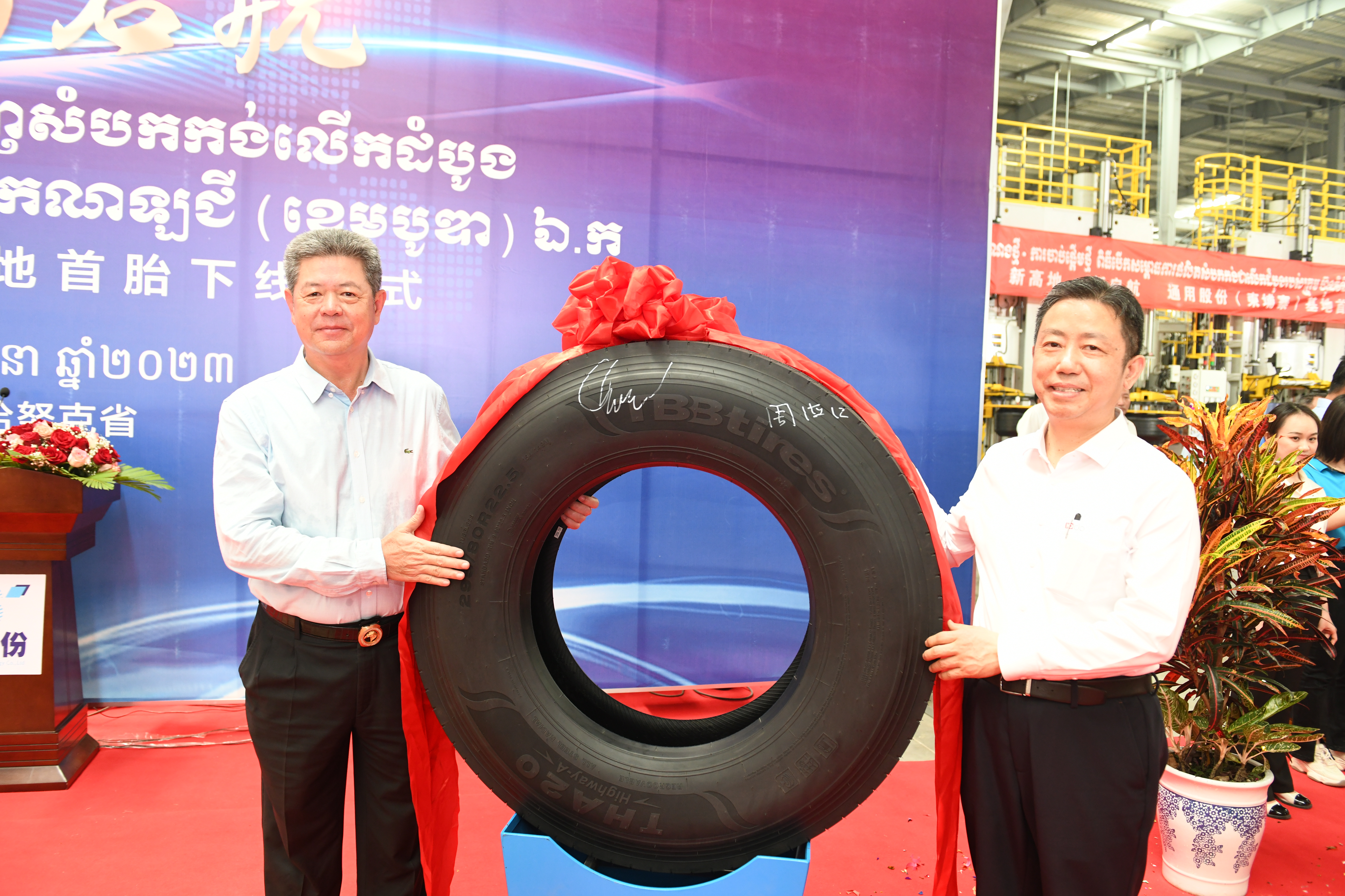 “5、4、3、2、1,出鍋!.......”3月18日,在通用輪胎科技柬埔寨公司總經(jīng)理陶國(guó)忠的倒數(shù)聲中,柬埔寨工廠首胎成功下線,標(biāo)志著通用股份海外“雙基地”的正式建成、全面啟航。在首胎下線儀式上,西哈努克省省長(zhǎng)郭宗仁、喬治·布什美中關(guān)系基金會(huì)創(chuàng)始人兼主席尼爾·布什,中國(guó)民營(yíng)經(jīng)濟(jì)國(guó)際合作商會(huì)會(huì)長(zhǎng)、紅豆集團(tuán)董事局主席周海江,通用股份董事長(zhǎng)顧萃等相關(guān)領(lǐng)導(dǎo)和全體員工共同見證了這一歷史時(shí)刻。
