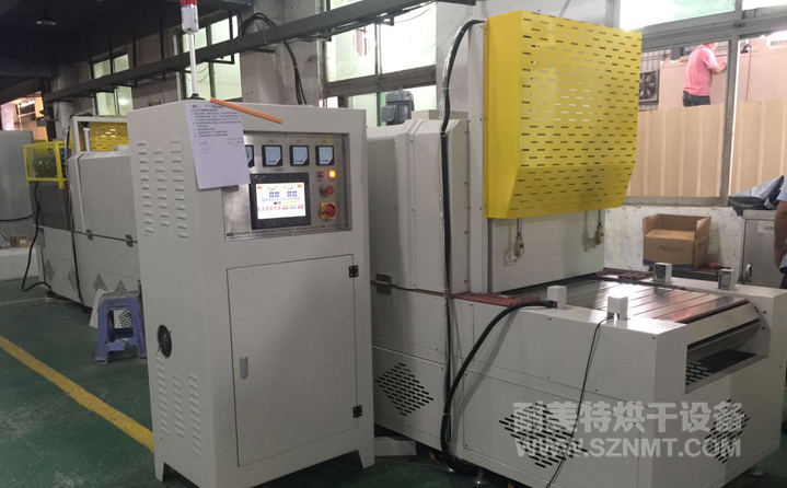 烘干部分總長(zhǎng)4800mm,前后配自動(dòng)提升門(mén),緩沖區(qū)兩端各長(zhǎng)300mm,冷卻區(qū)長(zhǎng)1200mm, 進(jìn)料部分長(zhǎng)600mm,出料部分升降接駁臺(tái)長(zhǎng)700mm ;